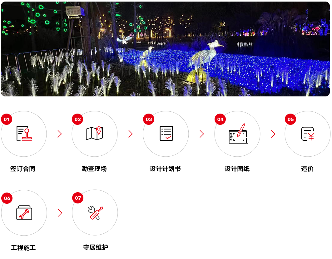 公司設(shè)計(jì)團(tuán)隊(duì)集合多年國際上新的設(shè)計(jì)理念、運(yùn)用燈光科技,將制作精巧、創(chuàng)意絕倫的彩燈通過傳統(tǒng)與時(shí)尚、文化與生態(tài)的結(jié)合,讓彩燈這傳統(tǒng)文化更富有視覺沖擊力和感染力。