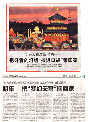 “正是基于此,提升彩燈產(chǎn)業(yè)的科技含量、完善上下游產(chǎn)業(yè)鏈、拓展衍生產(chǎn)業(yè)和加快彩燈產(chǎn)品出口貿(mào)易提上了最重要的議事日程,經(jīng)過(guò)精心籌備,‘東方彩燈制造出口基地’應(yīng)勢(shì)而生?!弊载暉糍Q(mào)有限公司董事長(zhǎng)蔡翔介紹,該基地將著力于無(wú)線音頻控制、智能變光控制、精細(xì)化傳動(dòng)控制等高新科技技術(shù)的研發(fā)與應(yīng)用,并嵌入彩燈創(chuàng)意產(chǎn)品、城市景觀亮化、道路照明、高新圣誕產(chǎn)品、微縮工藝品及仿真動(dòng)物類(lèi)等項(xiàng)目,“換句話說(shuō),這些項(xiàng)目將會(huì)讓自貢彩燈實(shí)現(xiàn)提檔升級(jí),科技含量更高,文化產(chǎn)品大幅延伸!”