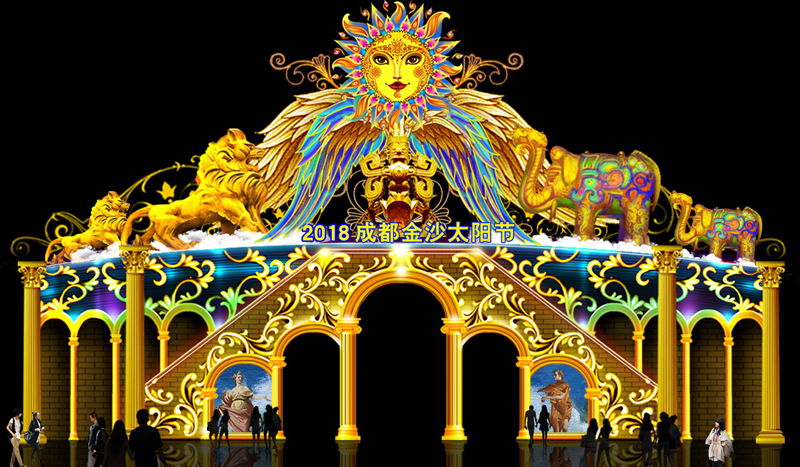 由自貢燈貿(mào)集團(tuán)股份有限公司承制的2018成都金沙太陽節(jié)燈展目前已進(jìn)入緊張有序的現(xiàn)場安裝階段。本次太陽節(jié)共分《龐貝文明》、《古蜀文明》、《太陽文化》、《傳統(tǒng)民俗》、《成都與世界》五大特色主題板塊共六十余組特色燈組,每一板塊都深刻卷寫著古蜀文明和龐貝文化的悠久與輝煌。