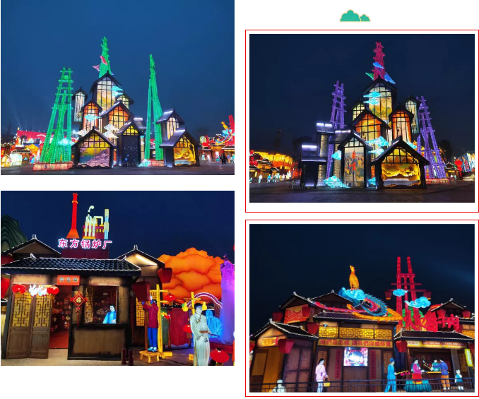 《自貢記憶》主燈組使用傳統(tǒng)材質(zhì)結(jié)合現(xiàn)代工藝,宏偉的天車獨(dú)創(chuàng)性的使用啤酒瓶制作,配合追光變色形成絢麗奪目的燈光效果。顯示屏剪影式表現(xiàn)自貢元素??铸埓┬?、錦鯉游動(dòng),還有靈活靈現(xiàn)的自貢歷史場(chǎng)景和人物,還原了一幅原滋原味又生動(dòng)的老自貢記憶。