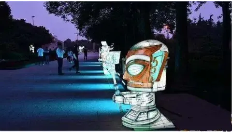 據(jù)自貢燈貿(mào)集團設(shè)計總監(jiān)陳潔介紹,在入口廣場處的燈組以青銅縱目面具為設(shè)計原型,作為三星堆“六大國寶”之一的青銅縱目面具,寬1.38米,高0.645米,眼睛呈柱狀向外凸,是館藏中形體最大的青銅面具。本燈組按比例還原青銅縱目面具,燈組高3.2米,寬3.4米。