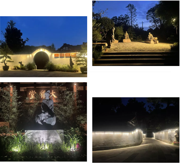 由燈貿(mào)集團承制的杜甫草堂“光的詩篇”夜游亮化項目,重現(xiàn)了詩人故居的田園風(fēng)貌,營造出濃厚的詩意氛圍,增加杜甫草堂的歷史厚重感,而且為這塊圣地增添了新的光彩為夜晚的草堂創(chuàng)造了一派朦朧、神秘、幽遠的“詩歌”意境。在夜色中走進草堂,亭臺廊檐間古楠參天,翠竹疏掩,桂香撲鼻,夜晚的草堂在燈光的映襯下,花草樹木、亭臺樓榭、蛙鳴蟲吟呈現(xiàn)出一派萬物和諧的景象;古建沐浴在金色的燈光下,輪廓清晰,姿態(tài)優(yōu)雅;高大的竹林和楠木在暖白色燈光的影射下,郁郁蔥蔥,鮮活靈動;水面的倒影與岸上的燈光交相輝映,相映成趣,構(gòu)成了一副虛實相間的立體燈光山水畫。這一個個場景,仿佛是詩歌的不同語句,一行行疊加,最終譜寫成為一首完整、美麗的“光的詩篇”。